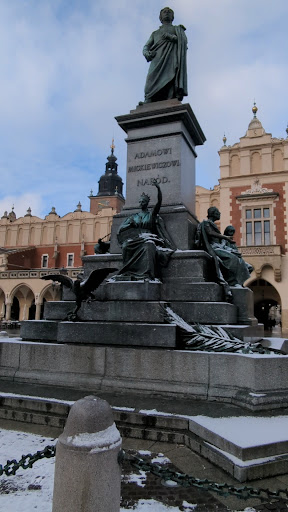 Wieszcz zastygnął w brązie w 1898 roku dłutem Teodora Rygiera. Rodził się w bóIach rozterek jurorów, którzy odprawiali kolejne prace i organizowali od nowa konkurs na pomnik Adama Mickiewicza. Warto wspomnieć, że sam Jan Matejko zamierzał przekonać komisję do swojego projektu. Nie udało się, co skrupulatnie odnotował Bolesław Prus: "Nagi wariat siedzi w fotelu, przed nim skrzydlaty wariat pokazuje mu orła... a obok nich jakaś baba czesze sobie włosy... Ośmieszylibyśmy się wybudowawszy Mickiewiczowi takiego dziwoląga..." Ostatecznie zdecydowano rozstrzygnąć konkurs ze wskazaniem na Rygiera. I stanął Wieszcz na krakowskim rynku. W mieście którego nigdy nie odwiedził nawet przez chwilę.