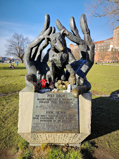 На набережной у стен Вавеля можно увидеть вот такой необычный памятник псу Джоку, реальная история которого постепенно становится одной из легенд Кракова. Джок был черной дворняжкой. Неподалеку от Грюнвальдского моста у его хозяина случился сердечный приступ, и он умер. Пес ждал своего хозяина на том месте, откуда его забрала скорая. Верный четвероногий друг вызывал у прохожих симпатию и восхищение. Местные жители подкармливали его, но поначалу он недоверчиво относился к людям. Примерно через год его приютила новая хозяйка, учительница на пенсии Мария Мюллер. Но женщина умерла в 1998 г. Вновь осиротевший пес не пережил смерти хозяйки. После побега из приюта для животных, как утверждают свидетели, он совершил самоубийство, бросившись под поезд в Свошовицах. Появиться этому памятнику помогли многие организации (в т.ч. Краковское общество защиты животных, польские СМИ) и известные люди, а также обычные жители Кракова, которым удалось изменить настороженное отношение властей города к этой затее. Его автор – Бронислав Хромый. Памятник изображает собаку, которая выходит из раскрытых человеческих ладоней и подает левую лапу. Памятник символизирует собачью верность, а также связь животного и человека. 26 мая 2001 г. состоялось его торжественное открытие и это был третий в мире памятник собаке – после Эдинбурга (Грейфрайерс Бобби) и Токио (Хатико). Надпись на краковском памятнике (на польском и английском языках) гласит: «Пес Джок. Вернейший из верных, символ собачьей преданности. Целый год (1990-1991) ждал на Грюнвальдской развязке своего хозяина, умершего на...