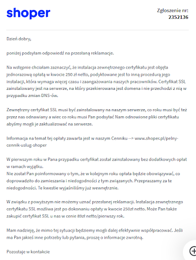 Dramatyczna jakość i czas obsługi problemów technicznych !!!!. Przez 5 dni roboczych nie udało się obsłudze zidentyfikować gdzie tkwi problem w braku możliwości dokonywania płatności poprzez shopera. Rozwiązanie tej zagadki nam zajęło czas potrzebny do wykonania jednego telefonu do operatora integrowanych w sklepie płatności i już wiemy gdzie jest problem. Shoper jeszcze nie wie bo w tym czasie wysyła maile o tym jak ciężko pracuje dział IT aby zidentyfikować problem. W grudniu, który jest dla nas sprzedażowo super miesiącem przez ponad dwa tygodnie nie działała nam skrzynka mailowa na shoperze. Zamiast rozwiązać problem wyłączono nam skrzynkę którą później cichcem łaskawie włączono ale nie udzielono nam wyjaśnienia co było przyczyną problemu.