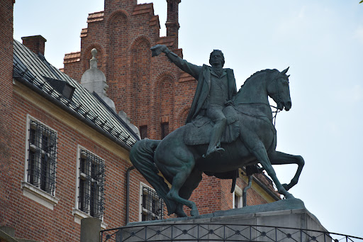 Pomnik Tadeusza Kościuszki na Wawelu – Symbol Pamięci i Historii Na dziedzińcu arkadowym Zamku Królewskiego na Wawelu, w bezpośrednim sąsiedztwie Katedry i Pałacu Królewskiego, wznosi się imponujący pomnik poświęcony Tadeuszowi Kościuszce – bohaterowi narodowemu Polski i Stanów Zjednoczonych, Naczelnikowi Insurekcji Kościuszkowskiej. Jest to miejsce o niezwykłej symbolice, stanowiące hołd dla jego zasług i przypominające o burzliwych dziejach Polski. Opis pomnika: Sam pomnik przedstawia Tadeusza Kościuszkę na koniu, w charakterystycznej, dynamicznej pozie, co oddaje jego wojskowy charakter i determinację. Postać ubrana jest w strój z epoki, a w dłoniach dzierży szablę, symbolizującą jego rolę jako dowódcy. Monument wykonany jest z brązu i osadzony na wysokim cokole z granitu. Jego prosta, a jednocześnie monumentalna forma doskonale komponuje się z zabytkowym otoczeniem Wawelu. Znaczenie i kontekst historyczny: Obecność pomnika Kościuszki w tak prestiżowym miejscu jak Wawel nie jest przypadkowa. Jest to hołd dla jego niezłomnej walki o niepodległość Polski, a także dla idei wolności i równości, które propagował. Kościuszko, jako postać tragiczna, ale i heroiczna, jest uosobieniem polskiego ducha walki o suwerenność. Pomnik przypomina o okresie rozbiorów Polski i o heroicznych próbach odzyskania niepodległości. Otoczenie i atmosfera: Otoczenie pomnika jest równie ważne jak sam monument. Dziedziniec wawelski, z jego renesansowymi krużgankami i majestatycznymi budowlami, tworzy unikalną scenerię. Spacerujący turyści i mieszkańcy Krakowa często zatrzymują się przy pomniku, by oddać hołd Kościuszce, zrobić zdjęcie czy po prostu podziwiać jego artystyczną formę. Z tego miejsca roztaczają się również piękne widoki na Katedrę Wawelską, co potęguje wrażenie historyczności i wagi tego miejsca. Pomnik Tadeusza Kościuszki na Wawelu to nie tylko rzeźba, ale żywy symbol polskiej historii i narodowej pamięci. Jest miejscem, które skłania do refleksji nad przeszłością i stanowi ważny punkt na mapie historycznej i...