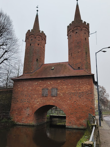 Read moreZwana także Portową lub Herbową. Powstała najprawdopodobniej z połączenia dwóch wież położonych na przeciwległych brzegach kanału. Jako jedyna w Polsce i jedna z dwóch w całej Europie budowli tego typu, stanowi unikat na skalę całego kontynentu. Dwukondygnacyjna, zbudowana została głównie z cegły i ozdobiona uproszczoną formą blendy typu stargardzkiego. Wieże wznoszą się na wysokość 28 metrów....