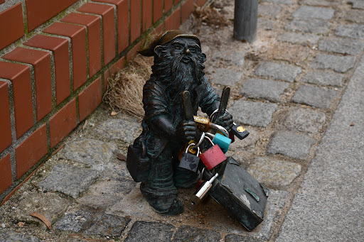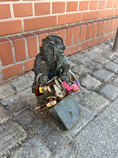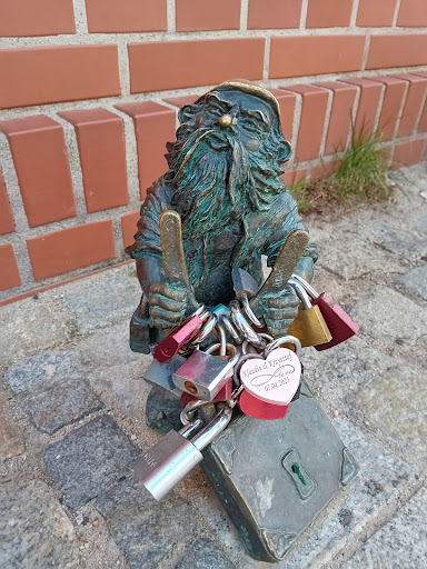 Read moreKrasnal nawiązuje do akcji kościelnej, która usunęła wszystkie kłódki z Mostu Tumskiego. Jednak jak widać wiele osób nie zgadza się z tym i w ramach protestu wieszają kłódki nawet na samym krasnalu. W pobliżu mamy innego krasnala, który niesie przeciętą kłódkę i razem z Rachciachem pomagają oczyszczać most ze znienawidzonych przez arcybiskupstwo symboli. CIekawe...
