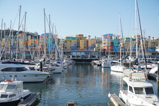 Intriguing architecture ensemble, in post-modernist style by portuguese architect Tomás Taveira, Master Plan by Sidónio Pardal. The Marina has the particularity of having been dug in a valley and feels landlocked within hills. The open sea cannot be seen from the public places, and most probably not even from the top floor of the houses that surround it, which is uncommon for marinas worldwide. Activity happens along the main Alameda, with everyday commerce ducked in the arcade; and along the northern edge of the harbour, with restaurants, cafes, bars, outdoor sitting, entertainment, amusement park type of activities and boat tour booths. The whole set tries to bring in the Albufeira downtown party feeling to the marina, and aims at the same British partying crowd (more pubs and bars than elegant french cuisine restaurants). Sometimes, the old fashion quaint interior design feels at odds with the festive and abstract architecture. One may hire boat services here to see the shore caves along the Algarve coast. The whole project feels cut off and isolated from the city and large empty plots surround the marina, apparently waiting for future investment that seems to be taking longer than expected. Pedestrian stairs up the hill link back to the town center, but consider the distance and the inclination before doing it. Besides a small church crowning the Alameda, it is, for now, a suburban theme park hidden in a valley on the western edge of the town...