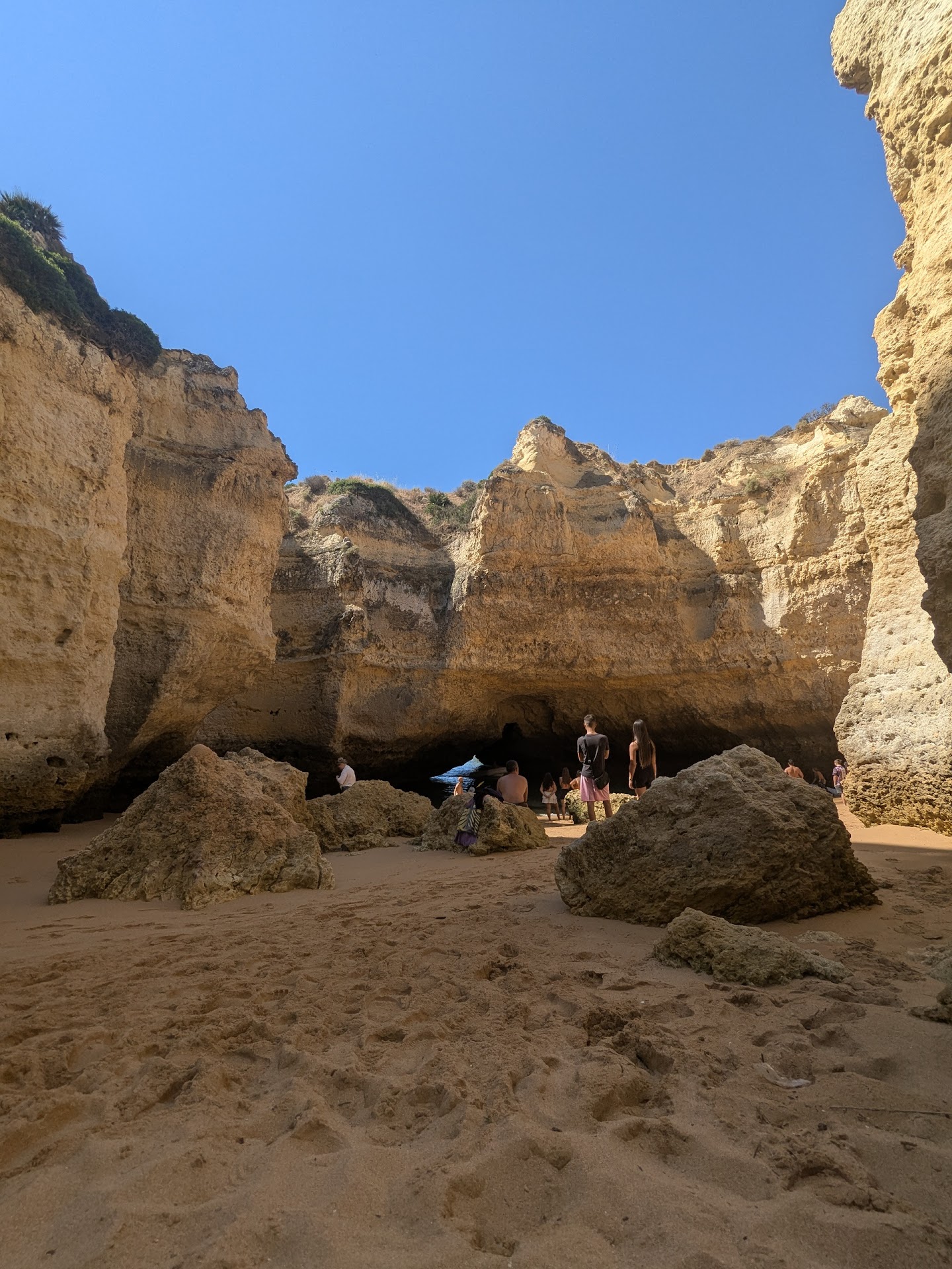 Read moreThat’s the second most beautiful beach in Albufeira/Algarve without any doubts!! The beach is tiny with a rock inside and from there you can cross a tunnel swimming and go to the secret beach on the right or just look out to the open sea. Some people do even cliff jumping in this beach.