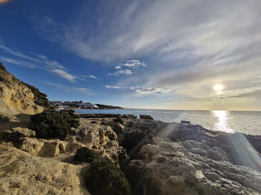 Praia dos Aveiros is a small blue flag beach in the area called Areias de São João or Saint John's Sands, in the town of Albufeira, Algarve, Portugal. The beach is enclosed in a small cove and is made up of fine golden sands and is flanked at either end by cliffs and rock formations.