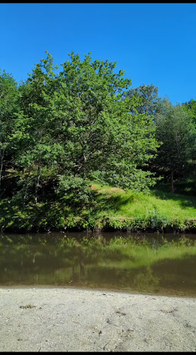 A nice place with good parking space, lots of picnic tables and some wresting chairs. Good shadows with lots of trees. No grilling equipment. A small sand beach with clean river ground. Sadly warnings to water not beeing...