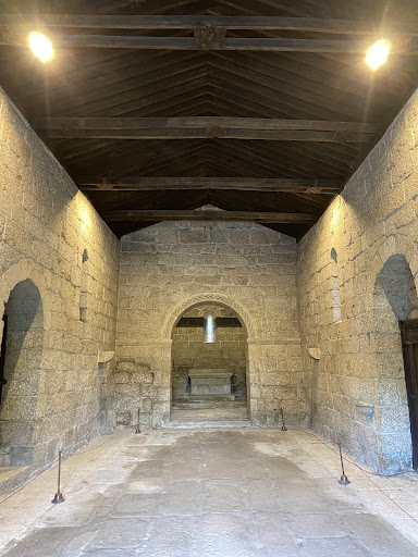 Read moreПроста церква São Miguel do Castelo є, на думку Мануеля Монтейро, «чіткою та типово романською спорудою завдяки її плануванню та дизайну її дверей, карнизів і модільйонів». Це храм невеликих розмірів, побудований із грубозернистого граніту цього регіону, без великих декоративних прикрас, з прямокутним планом, з одним нефом, із також прямокутним вівтарем, без кам’яних ініціалів і з дерев’яною стелею, за моделлю, подібною до багатьох інших церков того ж періоду. Арка перетину не є оригінальною, її замінили на іншу в 1795 році. Під час реставрації, проведеної між 1874 і 1880 роками, вони знесли її та перебудували відповідно до того, що вважалося оригінальною аркою вівтаря. На думку Мануеля Монтейро, незважаючи на ретельність цієї реставрації, арку вівтаря слід було зробити так само, як і головні двері, тобто зі стрільчастою аркою. Церква має троє дверей: головні вхідні та двоє, звернені одна до одної, вставлені в бокові стіни нави. Освітлення всередині храму забезпечується шістьма простими прорізами: один, у голові головної каплиці; інший, на фронтоні головних дверей, і два на кожній з бічних стін нави. Церква не має колон і капітелей, тимпани гладкі, а карниз і модільйони прості. Всередині пам’ятника досі видно десять із дванадцяти хрестів, якими була освячена церква. На зовнішній стіні нави, зверненій на захід, є дві гробниці-аркосоліуми, вставлені в товщу стіни. Вважається, що перша гробниця в аркосоліумі (рахуючи від фронтону головного входу) є місцем поховання прецентора Коїмбри Мартіма Паїса, який помер 5 січня 1223 року. Наступна гробниця, також в аркосоліумі, проста і позбавлена прикрас, є місцем поховання Жоао Анеса Енксате, адвоката номер один у місті Гімарайнш.