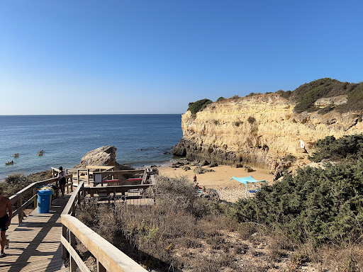 Read moreReally picturesque beach - at low tide you can explore the adjacent beach with a view of the “arc de triomphe” rock and some small caves - if you are brave - at high tide you walk round to the top to jump off the top (under guidance) there is a small parking area at the top of the stairs and along the single track road leading down. It also has a small cafe (pirate cafe) serving cold drinks and pizza (had a toilet ) which opened at 12. There is a life guard on the main beach and is also a drop off point for kayak tours. It was relaxed early morning but gets busy late morning onwards - with high tide and afternoon crowd people are more or less on top of you as it’s a small beach at high tide . The time we were there there was a load of seaweed which made water visibility poor and the adjacent beach was covered meaning no one wanted to use it . We enjoyed it until it got packed around 1 onwards . At low tide it’s better as you can explore through the small cave tunnel to the adjacent beach with a view of the arc de triomphe rock formation and there is more space on the beach . Fairly gentle incline for small...
