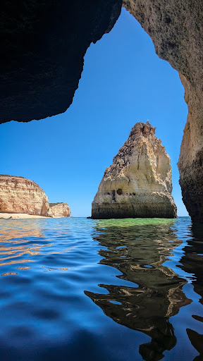 Available only when low tide when you're walking from Praia dos Caneiros, check the times and height of tides before going there, if you miss low tide being on this beach you almost can't get out only way is to fight with strong ocean waves or using a very thin rope and risk falling of the cliff or being killed by rocks. No stairs here, no lifeguard, no restaurant or toilets, not children friendly or for people on wheelchair, no sunbeds or umbrellas quite few people. Almost impossible to find parking place nearby. Breathtaking views. Water bit cold but crystal clear. Watch out for toxic dangerous fish called Black Peter it can hide in sand and fierce attacks your legs if you have bad luck meeting this fish here, you won't die but you will need to stay in hospital. Good for a walk but don't stay long here because of tides and strong current. That's why we love it, its very wild beach with few people. If you want more civilisation I recommend Praia da Rocha, Praia Carvoeiro. If you miss nature...