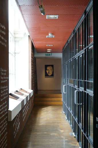 The museum is housed in a former water elevatory station, from the 19c. It was renewed into the actual museum by architects Santa-Rita in 1998. The interior architecture is of a post-modern style typical of the duo of architects, with the use of strong colors, play on spacial distortions and an unsettling fragmentation of forms, in an anxious search for drama (which sometimes gets exhausting). Where a corridor is particularly narrow, the visitor is thrown against a big window opening up to the Alfama neighborhood, as if the neighborhood was part of the exhibition - which could be, as so much of fado is rooted to it. There is a (almost) secret room. And the auditorium seems to be suspended over the space. Columns are oblique.