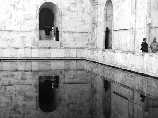 A: If you come before 13:30 you can look at the water reservoir which is basically a 20x20 meters basin below you, full with water. So deep that you can’t see the bottom of it, only a reflection of the ceiling that gives some kind of artsy feeling. The ticket costs 4.50€ and must be purchased ONLINE. They will also provide you with a QR code on site that takes you to their online ticket shop.
