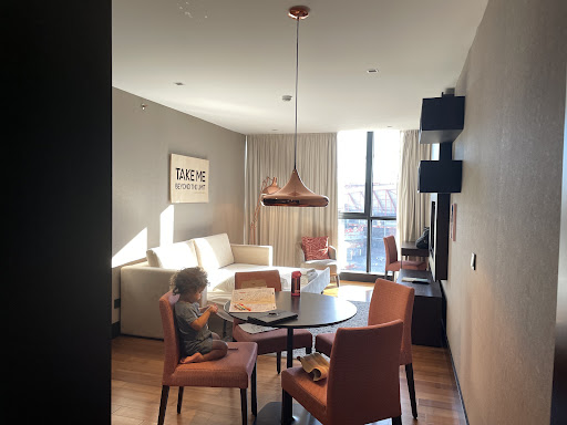 The aesthetic overall tries VERY HARD to be modern and clean. I found it to be uncomfortable, we are 3 small petite people and i felt I was going to knock down my toiletries. BRING A HANGING bag for toiletries there is virtually no counter space. The shower has that open floor plan thing except there is no lip and no slope so after the 3 of us showered the floor was soaked and water was going into the hallway. We asked for extra towels right away just to wipe it all up. This continued every single day. There are no wash cloths, I use a separate wash cloth each day for my face so I was annoyed by this. Bed was pretty hard, pillows were nice and there was a variety. Something which I think is huge for families!!!... You cannot bring breakfast from the included buffet up to your room. There was a mom trying to bring a plate of fruit up to her kids and they wouldn't let her. Also there is a 50% upcharge on every single item you order for room service or if you buy lunch or dinner and bring it up yourself. So if a burger is $12 Euro its now $18 Euro. This Sucked! After some days of walking and tours we just wanted to shower and relax and eat in our room. Ya know the room with a full kitchen and eating area??!!! Yea, that's apparently for when you grocery shop in Lisbon. There is not much of anything around here so bring leftovers from your day if you want to eat in your room or plan on cooking. (The location did feel very safe and it was a short walk to the metro!!!).
