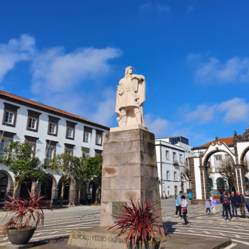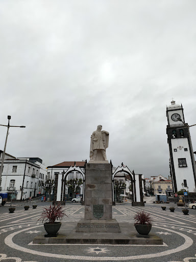 Quest'attrazione è stata di fatto la prima che abbiamo incontrato durante la nostra giornata inaugurale di visita in città. Giunti a Ponta Delgada sulle 13.00 🕐 direttamente dal nostro albergo, abbiamo parcheggiato nelle immediate vicinanze di Praça de Gonçalo Velho Cabral raggiungendo la stessa a passeggio 🚶🏻♂️. Proprio nel mezzo sorge questo monumento dedicato al celebre navigatore lusitano 🇵🇹, peraltro scopritore della più orientale tra le isole dell'arcipelago delle Azzorre, quella di Santa Maria. Sull'opera in sé, per la verità, non v'è moltissimo da dire, tanto più che in loco non è presente alcun pannello didascalico 🪧 a beneficio del visitatore. Ad ogni modo, la statua poggia su di un grande e squadrato piedistallo in pietra 🪨. Sul corpo principale di quest'ultimo si può osservare una versione bronzea del tradizionale scudo portoghese (lo stesso che campeggia sul vessillo nazionale 🇵🇹), mentre alla base è stato inserito il nome per esteso di Cabral in caratteri cubitali. La rappresentazione mostra il grande navigatore in posizione bene eretta con la testa protesa a sinistra e lo sguardo fisso verso l'orizzonte; le mani sorreggono rispettivamente una mappa (presumibilmente delle carte nautiche) e un lembo del mantello. A completare l'opera, un ulteriore e più ampio basamento impreziosito da un paio di vasi 🪴 collocati in posizione frontale. Belle le decorazioni in bianco ⬜ e nero ⬛ della pavimentazione in porfido della piazza. Il manufatto si trova all'interno di due cerchi concentrici adornato sui quattro lati da altrettante rose dei venti. Quella frontale, in particolare, racchiude nel mezzo un'intestazione: "PÓ DO PANTEÃO DOS CABRAIS DA FAMILIA DE PEDRO ÁLVARES CABRAL E DE GONÇALO VELHO CABRAL | Oferta do Município de Belmonte Ao Município de Ponta Delgada". Passando 🚶🏻♂️ di qua resta una tappa doverosa, oltre che CONSIGLIATA 👍.