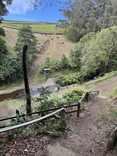 The route follows the Ribeiro do Sabão stream toward Fontinha and Caminho do Pau Grosso, passing rural pastures and notable spots like the Bica D’Osso stream and a giant eucalyptus tree over 5 meters in girth.