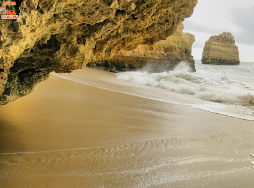 There is a secret (dark) cave-tunnel entrance to this tiny beach, or you can swim around from Marinha. At high tide, there really is no beach. Even half a dozen people at this beach seems crowded, so I would only frequent it at unpopular times or off-season. If it's a rainy day, it's likely to be...