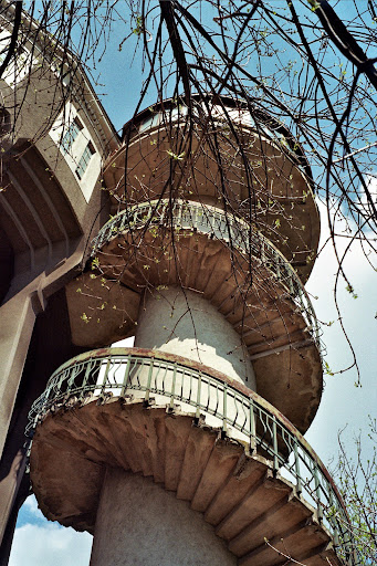 Water tower was transformed after 1982 in rotative bar with tables all around windows and bar in center. Also they build 2 other small towers and removed all water pipes . Was a elevator that make acces easier since stairs was quite narow . Total times in function just until 2000 after was close because rotative bar was broken. At ground level was restaurant with terrace . Unfortunally no other company show interests on restaurate as rotative bar since last time was repair on state funds . From this rotative bar view is wonderfull since cover all old town and river and close mountains . Update the mayor decide to invest and create an astronomical observatory...