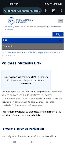 We registered for a tour a month in advance to secure our spot and diligently filled out the two oddly different booking forms on the National Bank of Romania Museum website. We received two confirmation emails (see photos attached), confirming that our forms had been successfully submitted. However, we received no further communication from the museum staff. Meanwhile, visiting slots on the museum's website continued to fill up until it eventually displayed the message: "The NBR Museum is fully booked between 16 December 2024 - 8 January 2025."