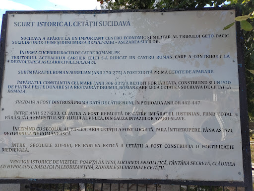 Cetatea Sucidava a fost inițial un centru economic si militar al tribului geto-dacic "sucii", ulterior devenind una dintre cele mai mari fortificatii romano-bizantine din Oltenia, datand din secolele al III-lea si al VI-lea dupa Hristos. Astăzi are o noua fata, renovarea care a durat 3 ani facandu-se din bani europeni, iar in interiorul sitului arheologic existând un circuit care permite si persoanelor cu dizabilități sa viziteze locul. Tot din banii europeni cetatea a fost împrejmuită, s-a construit un muzeu care are intrare liberă, s-au pus marcaje noi si s-a creat o zona pietonala care face locul accesibil in orice anotimp. Împăratul Constantin cel Mare a construit un pod peste Dunăre ale cărui urme se pod vedea si astăzi, pod care se întindea pe o lungime de 2437 metrii, fiind considerat unul dintre cele mai lungi din antichitate, dar a refăcut si drumul care lega Cetatea Sucidava de Cetatea Romula. Acest pod s-a creat cu scopul de a unii romanitatea de la nord de Dunăre de cea de la sud de Dunăre. După distrugerile provocate de invaziile hunilor, cetatea este refăcură in vremea lui Iustinian, rămânând pana in zilele noastre din perioada creștină, o bazilică, fântână secreta, cateva morminte, pilonul-turn al pasarelei constantiniene, poartă de Vest, fortăreața romano-bizantina, vestigii ale locuirii geto-dacice. Fântână secreta este cel mai fascinant loc din Cetatea Sucidava, un izvor subteran descoperit in 1958, dar construit in secolul al VI-lea cu scopul de a aproviziona cu apa garnizoana in caz de asediu. Basilica paleobizantina este si ea descoperiră in 1977 fiind cel mai vechi monument identificat pana in prezent la nord de Dunăre. Muzeul Cetății Sucidava este amenajat in clădirea de la intrare si expune podoabe, monede, obiecte de cult creștine, figurine din ceramică, vase, opaițe, diverse unelte casnice si gospodărești însoțite de note explicative. Fantana romana din secolul al II-lea este un put de vreo 14 m descoperit in curtea scolii, ce are o formă perfect circulara si căptușita cu cărămizi trapezoidale, in adâncimea ei gasindu-se vase si monede, unele chiar de pe vremea Împăratului Marcus Aurelius. Pe aleile Cetății Sucidava te poți plimba in voie observând resturi de ziduri de apărare sau de constructii, meritând puțin din timpul nostru chiar daca nu face parte dintre locurile turistice in care forfota turiștilor nu-ți da răgaz de meditatie si...