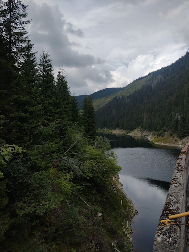 Barajul, răsărit de nicăieri parcă este acolo de când lumea și muntele. Are aceeași formă ca a celui din aval, iar în spatele lui, lacul cu apa scăzută la jumătate, strălucește în nuanțe de verde și albastru. Volumul este un pic mai mare, de 2 milioane de metri cubi.Silueta piramidală a Muntinului, cu ai săi 2061 metri, se oglindește în coada lacului. Suntem la 1305 metri altitudine, într-o microdepresiune unde râul Galbenu a creat un golf de toată frumusețea. În zonă, pădurile de pe versanti sunt destul de rare sau rărite, dacă vreti, drumuri forestiere brăzdează și lărgesc...