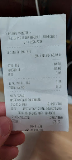 Plaja Cap Aurora Sector 1, plaja California, am fost în 2022 în iulie...Nu recomand, plaja este neamenajata, sunt multe plante, porțiuni cu alge și miros urat, iar cel mai neplăcut, ca peste tot litoralul, inchiriatul șezlongului este la preț preferențial, în funcție de zi de weekend...într-o zi costa 60 lei 2 șezlonguri, iar în weekend este 60 lei unul singur...mai exact tu plătești 120 pentru doua șezlonguri, dar primești bon de 60 lei...deaceea plecam în alte tari în vacanta. Știm că litoralul nostru nu are ajutor de la stat, este greu sa ai aceleași servicii, iar la terase sung angajați tineri, studenți care nu au nici o vina, dar a 2 a oara nu am sa mai vin la aceasta plaja. Deja se vad consecințele, sunt 2 sau 3 familii pe toată plaja..Menționez ca în acest preț de 120 lei îți oferă anumite bauturi gratis la bar, de calitate inferioara bineînțeles, pentru cei nepretențiosi, dar la 120 lei plătiți începi sa ai pretenții...sau asteptari mai bune..asta este, clientul este vinovat ca merge acolo, nimeni nu îl obliga nu ? Mare atenție dragi romani pentru ca muncim din greu pentru...