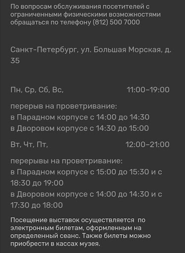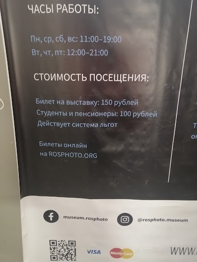 Read more"РОСФОТО" - музейный выставочный центр на Большой Морской улице д. 35 (этажи 2, 3). Это удивительное место. Сюда очень приятно заходить даже ради интерьеров. Здание построено в 1907 году. Это доходный дом страхового общества эпохи Модерн. Внутри находятся старинные печи-камины, отделанные израсцами. Здесь две площадки. Очень атмосферное и по домашнему уютное место. Здесь очень спокойно. Имеется магазин в котором можно приобрести печатную продукцию и открытки. Стоимость билетов 100 - 150 рублей. Очень удобно расположено. Рядом с Исаакиевским собором. Очень удобно добираться. Пешком от станции метро "Адмиралтейская" всего 5 минут. Можно доехать на автобусах, идущих от Невского проспекта, маршрут 3, 10, 22, 27. До остановки "Исаакиевский собор". Это Малая Морская улица и пешком обойти отели "Англитер" и "Астория", выйти на Большую Морскую улицу и подойти к дому 35. Можно доехать на автобусных маршрутах 3, 22, 27, идущих в сторону Невского проспекта. Выйти на остановке "Исаакиевский собор". Остановка находится практически напротив здания "РОСФОТО ". А также можно доехать на троллейбусах маршрутов 5 и 22, идущих в...
