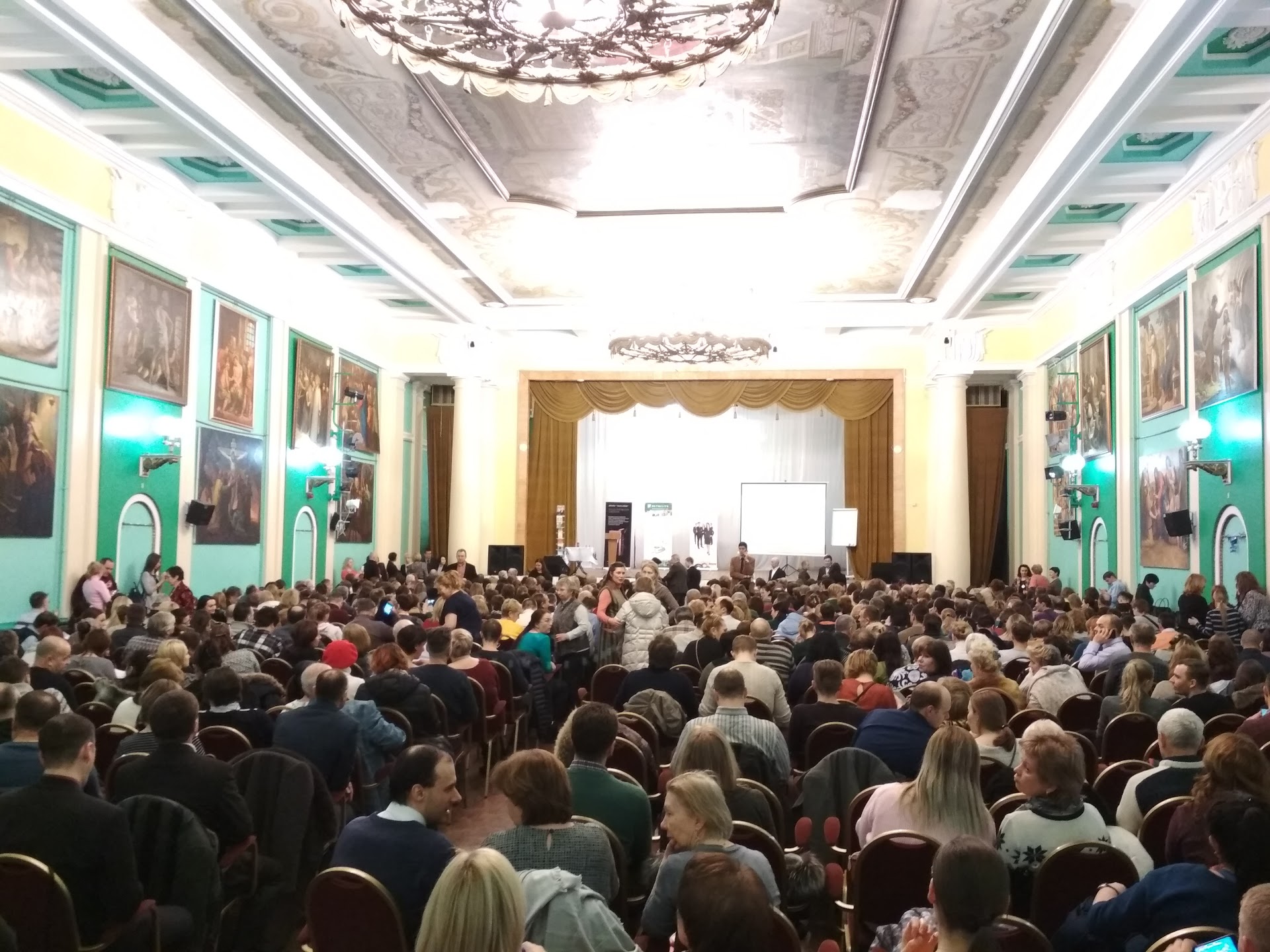 Read moreСтарое сталинской здание. Ранее был храм, даже запах ладана чувствуется. Величественно, лестница застелена ковром, когда-то бывшим новым и чистым. Мы занимались в очень Примечательном зале : высокий потолок, расписанный в лучших традициях советской символикой и стены, оформленные картинами совершенно различными, говорят подлинниками. Креслица в зале оказались удивительно удобными. Конечно, название Конгресс-холл в моём воображении соответствует совсем другому...