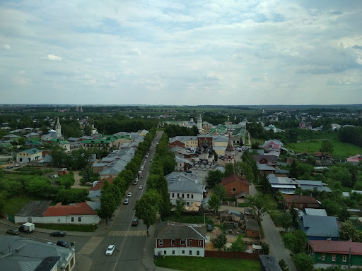 Ризополо́женский монасты́рь — женский монастырь Владимирской епархии Русской православной церкви, расположенный в центре Суздаля. Один из немногих монастырей России, достоверно основанных ещё до монгольского нашествия. Существующий ансамбль зданий сложился преимущественно в XVI—XVII веках. Застройка северной части обители была уничтожена в советское время. В церковной истории прославлен духовными подвигами монахини Евфросинии.башня, ныне являющиеся частью стены Ризоположенского монастыря. В 1764 году Троицкий монастырь был упразднён, а его земли и постройки отошли к более старому соседу. В начале XIX века на территории монастыря под руководством каменщика Кузьмина была воздвигнута 72-метровая Преподобенская колокольня. Последней на территории монастыря была выстроена Сретенская трапезная церковь, выполненная из красного кирпича в русском стиле (1882).