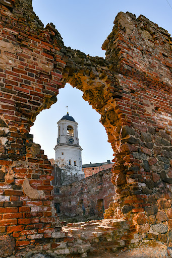 Belfry and ruins of the Old Cathedral. The first Roman Catholic Church was built in Vyborg in mid of XIV century. Present belfry and cathedral were built during the last decade of the XV century. In mid of XVI century, Sweden adopted Lutheranism as the state religion, and Finns had to do so too. The upper part of the belfry was added in the XIX century. First time, the cathedral was badly damaged in 1710 when Admiral General Count Theodore Apraksin (1661-1728) captured the city from Swedes during the Great Northern War of 1700-1721. Citizens didn't want to restore the cathedral and Tsar Peter I of All Great, Little and White Russias (1672-1725) financed restoration from his own funds. Old cathedral was abandoned in mid of XIX century when new cathedral was built in Vyborg. Since 1913, it became the Regimental Church of 8th Finland's Shooter Regiment of Russian Imperial Army. Since 1918, it has become the Garrison Church of Finnish Army. Church was badly damaged in the process of assault of Vyborg on March 12-13, 1940, during Soviet-Finnish Armed Conflict aka Winter War of 1939-1940. Although there were no fierce street combats in Vyborg because the city was abandoned by the Finnish Army without resistance. Cathedral badly suffered in 1944. Vyborg, 🇷🇺Russian Federation🇷🇺....
