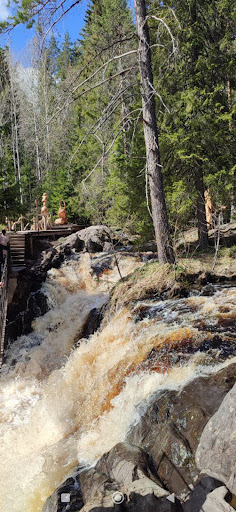 Место расположено по дороге между Петрозаводском и Сортавалой. Ближе к Сортавале и, соответственно, к горному парку "Рускеала". Была неоднократно в разное время года. Каждый раз приятно удивляюсь, как благоустраивается и облагораживается территория. На мой взгляд для массового туризма - это хорошо, потому что становится гораздо безопаснее. И в культурно-эстетическом плане, по-моему, одни плюсы: появились туалеты, большая автостоянка, дорожки, деревянные настилы, мостки, киоски с сувенирами и едой. Очень понравились и деревянные скульптуры сказочных персонажей и гигантских насекомых. Конечно же, мы всё больше вторгаемся в природу, но здесь получилось как-то органично. Да, мы едем в первую очередь за красивыми видами, за эмоциями, впечатлениями. И на этой локация, которая входит почти во все сборные туры по Карелии, есть традиционный для всех водопадов грохот, шумные потоки бурой от перенасыщения железом воды, река, причудливо изгибающаяся между каменистых берегов, образующая тихие пенистые заводи. *Водопад известен тем, что здесь снимали сцены купания героини Ольги Остроумовой (Женьки) в советском фильме "А зори здесь тихие". Однозначно рекомендую к посещению!...