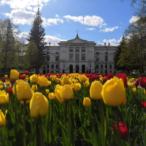 Перед фасадом главного корпуса университета было решено посадить ели, имевшие своей целью скрыть длинные «крылья» здания и помочь центральной части фасада зрительно вытянуться вверх. Все посадки производились по заранее разработанному П. Н. Крыловымплану — вначале были посажены местные хвойные породы, черёмуха, бузина, рябина. А под укрытием этих зимостойких видов кустарников и деревьев позднее были высажены растения, привезённые из Европы, Северной Америки, с Дальнего Востока.