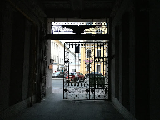Вход в этот дом напоминает вход в гробницу и украшен статуями Бога Ра. Вот уж точно – «не достоин глупый раб ночевать в этом храме". В начале 20 века был очень силен интерес к древним культурам, традициям, различным мистическим течениям, поэтому древнеегипетская символика на фасаде этого дома полностью соответствовала духу того времени».