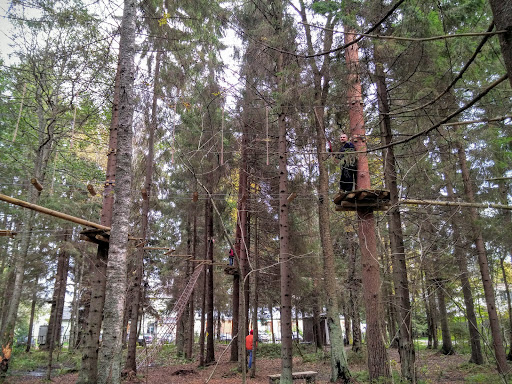 Дорога туда ведет по огромным ямам, сквозь поселок, но место отличное, парковка есть, но в выходные вся заполнена, есть туалет и мини кафешка, цены в которой конечно завышены. Но зато территория лесная, дышится хорошо. Главное, не вставайте в инструктаж с детьми, это просто навечно, они отвлекаются, не слушают, а ты стоишь и ждешь их вечность просто, потому что инструктор ждет выполнения тестовой трассы от всех по очереди. Вообщем-то главный минус этого места, дети,которых родители заставили идти на трассу, где им страшно или тяжело, и тк на одной платформе нельзя собираться больше 3х человек, а впереди ребенок не хочет идти дальше, и его снизу заставляют родители, то ты на 15тиминутной трассе, стоишь больше часа блин. Претензия не касается впринципе детей, там много смелых и ловких, быстрых ребят, которые никого не задерживают. Но вот эти родители, которые заставляют идти сюда ребенка, а потом на трассе уговариют идти дальше, вы вообще блин зачем это делаете? Вы мешаете остальным и совершенно не слышите своего ребенка, это же все должно быть в радость. Я за 2 часа, что была там встретила несколько таких бедных детей. Они сами замученные и всех замучили. А виноваты упертые родители. Я советую персоналу парка обратить внимание на родителей и их детей. И ввести правило, что если ребенок боится идти дальше, то пусть пропускает всех и ждет спасателя, который его снимет, а не задерживает...