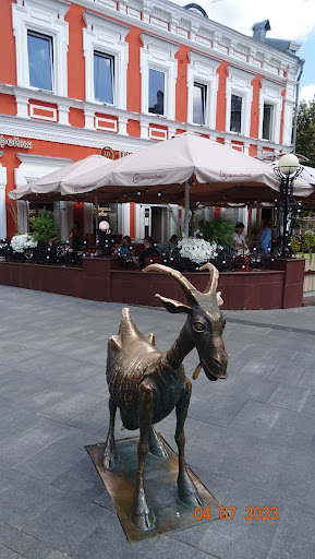 Read moreОчередной металлический шедевр на Большой Покровской... Не осталось, наверное, персонажей ни среди людей, ни среди животных и птиц, не отлитых в металле неизвестными скульпторами и не размещённых на каждом квадратном метре главной туристической артерии Нижнего... Коза, правда, получилась больше похожей на спилберговского динозавра из Парка Юрского периода... Ну, так...