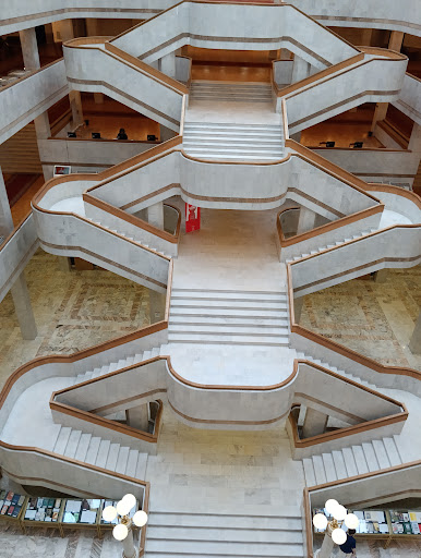 Read moreПубличная библиотека... РНБ... Новое здание. Последний выдох господина ПэЖэ! Здесь можно увидеть как в период позднего застоя думали о комфорте для интеллектуалов... Ну, правда, думали-то по-разному... Но так - очень возвышенно, с каким-то даже трепетом и пиететом - тоже думали... Но получилось, как известно - как получилось. Здесь любой сотрудник с готовностью ответит вам всегда, а особенно сейчас, почему вы не можете воспользоваться никакими услугами: библиотекой - потому что вы, например, не записывались через интернет или по телефону, камерой хранения - потому что вы, например, не предъявили читательский билет, гардеробом - потому что у вас, наверное, нет перчаток и маски... При этом и в библиотеку пропустят, и вещи примут, но дадут понять, что родина просто в данном случае идёт вам навстречу, и вы должны это понимать. Вы можете побывать здесь с экскурсией, а можете - без, но при этом вам наверняка запомнятся удивительные (меня, например, это не перестает удивлять уже лет двадцать) места, отгороженные от посетителей красно-белой аварийной лентой (не в поддержку народа Белоруссии, упаси Бог!) - у камеры хранения в гардеробе, на четвертом этаже в читальных залах. Тут, там - проход запрещен! А что так? Ну, так... Читальный зал, понимаете, построен очень большой, а народу ходит не так много, ну, и, если вы пришли почитать, поработать, что вам обязательно уединение в дальнем уголке или посередине пустого читального зала? Это скажется на вашей производительности? Ничуть! Так что покучней, уважаемый, не отбивайтесь от коллектива! Да и об уборщицах надо подумать - им же убирать за вами, мало ли после вас мусор какой останется - ну, там, бумажки или ручку забудете, или от чипсов пакетик, или просто наблюёте? А на первом этаже проход закрыт - туалет. Вам что на четырех этажах туалетов мало? А это ... прямо неудобно даже... служебный! Мало ли директор пописать захочет? Или та же гардеробщица? Ей что со всеми вместе идти оправляться? Ну, вы прямо, даёте... И так с момента открытия... И вряд ли что-то изменится.. само... Наша РНБ, ее новое здание - это образец высоких нравов! Ну, правда, если нравы у вас не высоки, то и вас здесь тоже рады видеть. Наша РНБ (новое здание) - образец высокой нравственности и духовности!.. для всех! Духовности - для всех?!. Ну, и, значит - общедоступности... Noblesse oblige... Публичность... Она не бросается в открытую на вас на Невском (секс-шоурумы не в счёт)... но если вам нужно,.. то она всегда к вашим услугам. Позвони. В...