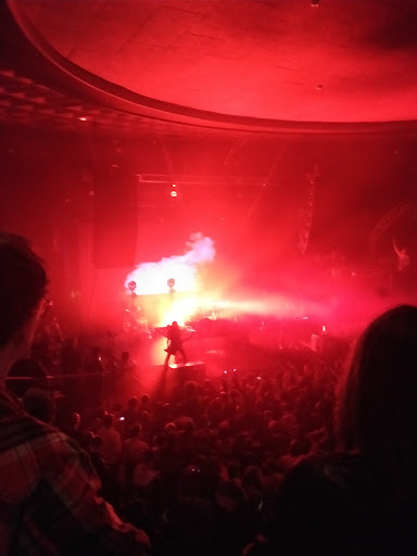 The entrance is facing the parking lot. Go past the cloakroom and upstairs. The decor is dark, whether for the atmosphere or to simplify the task of the cleaning staff who can say. The audience pit is circular, with raised platforms (about a metre) around the circumference. This gives refuge to those afraid of the mosh pit. They look like they'd also make great launching platforms for crowd surfing, but I've yet to see them used for that purpose. The seated area is on a balcony-type thing overhead. I suspect they get great sound there. In the pit, it varies.