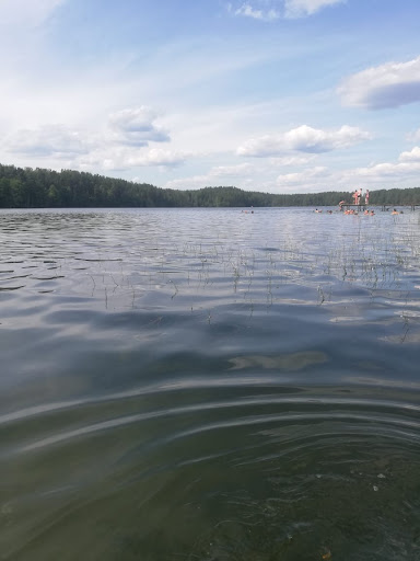 Прозрачная голубая вода, рыбки плавают. Глубина просматривается на 2 метра. Песок на общественном пляже. Камней подводных нет. Есть места без пляжа, но где можно встать с палаткой у берега. Комаров днём и вечером(жаркий июль 2021) не было - были слепни. Подъезд на машине на расстоянии 120-150 метров от озера, «лесная парковка». Есть бак для мусора у парковки.