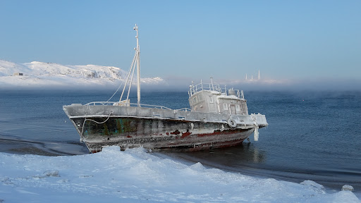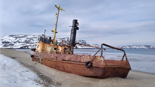 The sand beach of the nonfrozen Teriberka bay of the Arctic ocean. It is usually very windy here. Moreover, it is often extremely cold in winter. Take as much as possible winter clother if you would like to come here. Hopefully, the temperature of the water is about 6 degrees of Celsius, it is also salty. There are many beautiful landscapes, snowy rocks, abandoned old ships, etc. you can see here. In night, there is a good chance to see aurora...