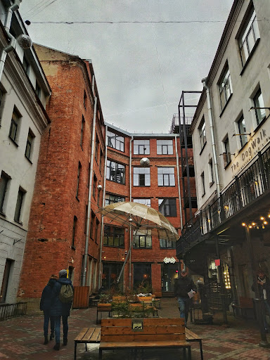 Бертгольд Центр. Очередное шикарное творческое пространство в центре Питера со своей атмосферой. Чтобы попасть сюда, надо не пройти мимо указателя в арке, так как всë пространство спрятано во дворе. Но и во двор сразу есть вероятность не попасть, так как нужно сначала миновать арку, в которой по бокам уже попадутся по левой стороне крутые магазины одежды, пластинок, и сувениров с подарками - по правой, в которых можно зависнуть минут на 10. Сам же двор встретит вас, наверное, самым большим зонтом города (а, может, и не только) и обилием заведений, каждое из которых обладает своим стилем, но все они в совокупности создают одно большое лофтовое пространство, уместившееся в столь малом дворе. По факту, это артпространство вдохнуло новую жизнь в здание, где раньше была типография. В этом весь Петербург! Тут найдëтся всë или почти всë для приятного времяпрепровождения: коворкинговые зоны, творческие студии, магазины уличных брендов одежды, бары и пиццерия с нереального размера пиццей, прекрасная спешалти кофейня с множеством видов сырников и много-много разных других помещений! Отдельно можно выделить также бесплатный выход на крышу со смотровой площадкой, откуда будет очень достойный вид на крыши домов, упирающиеся в купола и небосвод вдали! Очень советую...