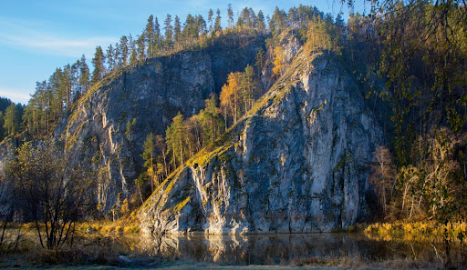 The park provides paths and access to particular land-forms of interest. These include the "Saga Waterfall", a multi-tier cascade over rocks to a calm pool and grotto from a height of 15 meters; the "Tsar's Gate" rocks, a large formation with a hole through it on a rise over the Mrassu river; the "Moonlight" cave, 200 meters long and covered inside with stalactites and stalagmites; the "Azasskoy" cave, which boasts a large gallery; and over 60 other named caves and outcrops.