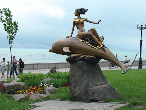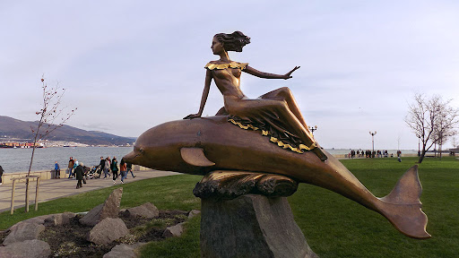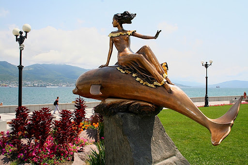 Скульптура "Девушка на дельфине" в Новороссийске расположена на набережной Адмирала Серебрякова. Эта скульптура имеет и второе название – "Дельфин и русалка", хотя это не соответствует нашим представлениям о "классических русалках": у девушки нету рыбьего хвоста или чего-то на него похожего. Скульптурная композиция высотой 2,6 метра изготовлена из черного металла окрашенного в бронзовый цвет. На каменном постаменте (это природный валун) с импровизированной волной расположился довольный и счастливый дельфин. На его спине грациозно и с устремленным к морю взором сидит девушка с развивающимися по ветру волосами. Скульптура стала популярной как среди гостей города, так и среди местных жителей. Очень часто сюда приходят фотографироваться и взрослые, и дети, кто-то для этого даже взбирается на дельфина. В народе существует поверье: отправляясь в дальнее путешествие нужно потереть спину дельфину, и тогда оно для Вас будет удачливым. Известно, что установлена скульптура "Девушка на дельфине" в 2007 году. Ее авторами стала не безызвестная в Новороссийске пара выдающихся скульпторов – Суворов А.И. и...