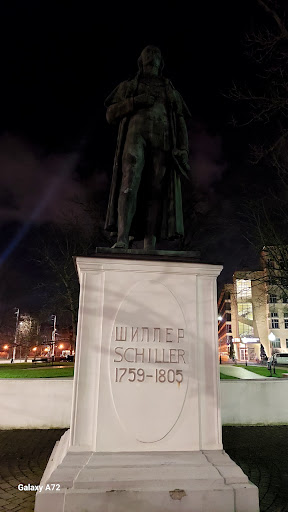 Сквер, фонтан и Шиллер! Это сочетание знакомо каждому калининградцу! Более ста лет этот памятник немецкому философу и поэту Фридриху Шиллеру находится на этом месте! И установлен он в 1910 г.в честь юбилея городского оперного театра Кёнигсберга, первой постановкой которого была драма Шиллера " Вильгельм Телль". Сохранился памятник в годы войны. На фоне истребления всего немецкого и ненависти нашего народа к " неметчине", на памятнике в период штурма Кёнигсберга появилась надпись" Не стреляй! Свой!" Конечно, памятник был несколько повреждён осколками и у статуи было прострелено горло,но впоследствии реставрирован и "живёт" до наших дней!!! И прекрасно вписался в пространство " театрального сквера"!!!! Что создаёт особую атмосферу гармонии, красоты!!!! Одно из самых уютных и интересных мест центра...