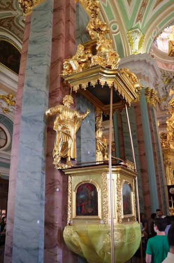 The interior of the church is ornate and highly decorative, similar to what you might have seen visiting Baroque churches in central Europe. Here you will see delicate chandeliers, marble corinthian columns, a decorative pulpit with gilded figures as well as vaulted ceiling with frescos. There are also traditional Russian Orthodox aspects in the impressive iconostasis as well as the tombs of Peter the Great and other members of the royal family.