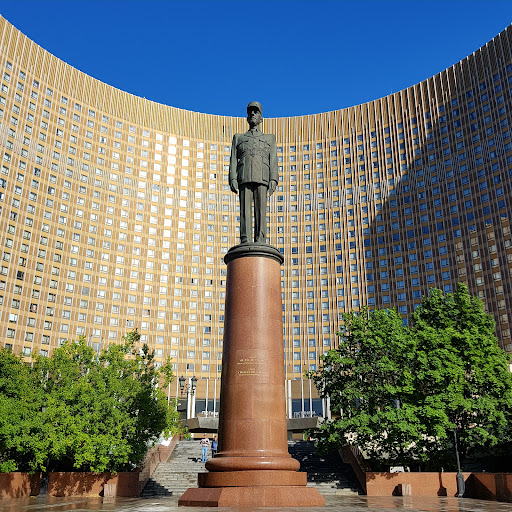 Ressaltada pelo semicírculo da fachada de cristal do hotel, a enorme estátua do general De Gaulle fica separada pela moscovita Avenida da Paz de outra famosa construção vertical, o monumento à Conquista do...