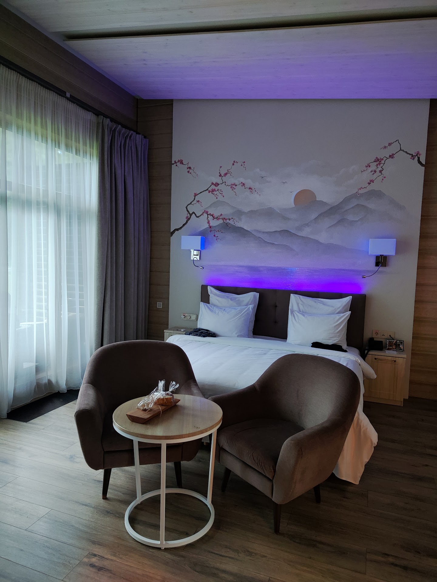 Решили остановиться здесь на две ночи - ехать недалеко от города, место нам незнакомое, но по обещанию вездесущей рекламы - красивое, еще и есть чем себя занять (лыжи горные, беговые, ватрушки, каток, и даже есть где погулять) Если кратко: оно того не стоит. Эти два дня были одним нескончаемым анекдотом. Анекдотом за 30+ тысяч рублей без завтраков. Выбрали номер с отдельным входом и камином. Для двоих - прекрасно, вот только по факту заселяют в дуплекс, и за стенкой имеется сосед, которого в ночной тишине прекрасно слышно, даже если человек просто разговаривает (наши соседи, спасибо им, ничего не отмечали, а просто беседовали). Заселились в 17 00 (таковы правила курорта), после чего я пошла в душ, где у меня в первую же минуту вырвало потоком воды шланг из смесителя. Ну окей, бывает, помылась под тропическим душем (утром сантехник заменил шланг). После ужина вернулись в номер, решили разжечь камин - задорно прогорела щепа, а вот дрова обуглились и пошипели, и через 15 минут огонь закончился. В десять часов вечера звонить на рецепцию по поводу сырых дров мы уже естественно не стали, поэтому засыпали под бубнеж соседа из-за стенки, а не под потрескивание камина. Утром позвонили на рецепцию по поводу дров и смесителя, а еще - по поводу воды, которой почему-то было 3 бутылки по 0,5 на двоих взрослых людей, и она закономерно за вечер закончилась. Молодой человек на том конце провода любезно спросил, сколько мне нужно воды, на что я ответила, что нужно 6 бутылок (1,5 литра на человека, соотвественно), после чего получила обещание принести через 10 минут, а также, внимание - что воду записали в наш счёт. Серьезно? Платная питьевая вода в отеле, который себя позиционирует как 5 звезд? Это дно, товарищи). За мой опыт путешествий ни в одном отеле разного позиционирования не брали денег за питьевую воду. Ни в Европе, ни в Турции, ни в Африке. Справедливости ради даже в других отелях Ленинградской области такой экономии нет (та же Точка на карте). Ну ок, пить что-то надо. Бутылки принесли, внимание - в мусорном месте. Чёрный такой, тоненький. Мы его оставили в номере и пошли завтракать (пиццерия местная классная, кстати). Погуляли пару часов, вернулись в номер. Мешок с водой по какой-то загадочной причине исчез, сумки оказались сдвинуты к кровати, на столике с кофе и чаем появилось 4 бутылки воды. Звонить на рецепцию и заниматься выяснениями я не увидела смыла. Пошла погреться в душ, где по какой-то загадочной причине не оказалось полотенец. Вообще никаких. То есть использованные забрали, а новые не положили. Спасибо мне, я обратила на это внимание до того, как пошла мыться. Что хорошего? Красивая территория, чудесный инструктор по горным лыжам Дмитрий, который несмотря на приличный мороз и вечернее время был спокойным и позитивным, вкусная пицца. Было вкусно в ресторане около склона (Apres ski), но официанты не торопливы от слова совсем. Что плохого? Не чувствуешь, что о тебе заботятся. Почему-то приходится тормошить персонал, чтобы получить необходимые вещи. Горничные по всей видимости считают, что перемещать сумки гостей и распоряжаться водой - нормально. Платная питьевая вода (серьезно, я до сих пор в шоке). Стоимость воды, справедливости ради, мы так и не узнали - при выезде на рецепции сказали, что это комплимент за сырые дрова. Вроде бы и хорошо, но давайте сравним стоимость четырех бутыло