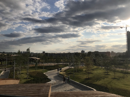 Если рассуждать объективно, то лушим является то, что данный парк появился и имеет место быть в данном месте. Думаю, что в процессе роста высаженных деревьев количество мест, где можно спрятаться от солнца в знойный день - увеличится. А пока - очень жарко гулять с детьми по этому парку. Дизайн металлоконструкций, которые пронизывают пешеходные дорожки по прогулочным маршрутам - неплох. Но корреляция металла с деревянной отделкой - вызывает сомнения и "досадную улыбку" на лице в части качества исполнения строительно- монтажных работ! Но еще раз повторю, что лучше так, чем никак. Ибо пятачок смрадной промзоны заиграл свежими мазками дизайнерской мысли. Парк хорошо виден от МЦК пассажирам Ласточек, имеет хорошую спортивную зону. Велотренажеры (рассчитанные скорее на ребенка-лемурийца ростом от 3 м нежели на среднестатисического москвича ростом 170-185) неудобны, неэргономичны и навряд-ли несут хоть какую-нибудь позитивную функцию оздоровления человеческого организма. Детская площадка напротив хороша и просторна, креативна и весьма интересна не только подрастающему поколению, но и толпам позёров разного пола, занятых фотосессиями в формате, мало приемлемом для детского присутствия. Мой сын с искренним недоумением наблюдал как в центре детской прощадки 2 девушки снимали друг друга на фотокамеру так усердно, что в пылу "профессионального азарта" разве что ноги выше головы не поднимали, не стыдясь оголять наличие/отсутствие предметов нижнего белья. Такую "одаренную искусством" молодежь я бы прогонял подалее от глаз невинных детей. Изюминкой парка является пруд сложной геометрической формы. Он действительно хорош. Дает прохладу в зной. Многие посетители парка сидят на удобном каменном обрамлении пруда, свесив в прохладную воду ноги. Но, было бы совсем хорошо, если бы этот пруд подвергался чистке дна в частности и поверхности воды в целом!...