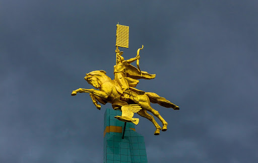 Покрытый сусальным золотом восьмиметровый памятник располагается на 15-метровой стеле, установленной на искусственном кургане.
