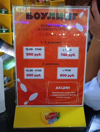 Read moreХодили в Боулинг (находится на 3 этаже ТЦ "Кристалл") в конце июля 2023 года. Была суббота и вечернее время - так что обычно в это время загруженность бывает максимальной и нам не повезло, пришлось брать VIP дорожку №6, единственная которая была доступна для брони - цена вопроса составляла 900 руб. / за час (официальный прайс по дорожкам - так же сфоткан и прилагается), для сравнения обычные дорожки (с 1 по 5) в это время суток стоят 740 руб, что примерно на 20% дешевле. В последствии - я так и не понял, в чем VIP отличается от простой дорожки за тем исключением, что с 6-той дорожки справа нет никого и далее открывается вид на барную стойку. Ну а так же - на VIP дорожке был зафиксирован самый низкий рекорд (234 очка), по отношению к другим 5 дорожкам (245, 279, 268, 266, 257), что говорит о том, что она "не так эффективна", если вы хотите играть на очки. В нашем случае - шар всегда немного смещался влево (предположу - что немного неровный пол, с уклоном налево). Вообщем, дорожку №6 (она же VIP дорожка) - для эффективной игры, а так же игры "на результат" - я бы вам ее не рекомендовал как раз из-за смещения шара влево.