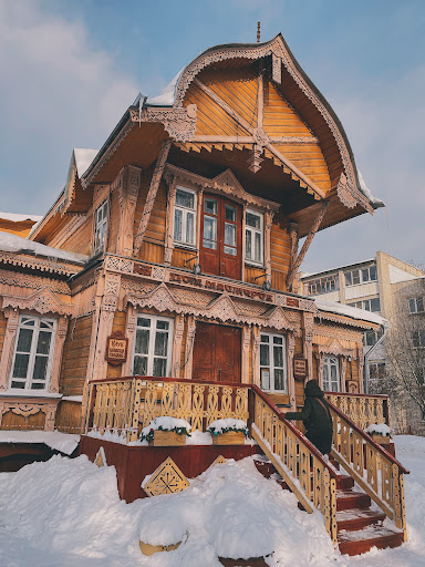 в таком доме, как мне кажется, могли бы жить все персонажи русских сказок ✨ . что почти так и есть, ведь тут живет история ремёсел Калужской земли, старые технологии изготовления вещей времён ещё когда наших ба и де в помине не было . этот теремок притаился в переулках старой Калуги, является памятником истории и архитектуры и даже имеет свою страницу в Википедии . его украшает деревянная резьба середины 19 века, странно, что нас не таскали сюда на пленён во времена художественной школы 🤔 . а внутри есть невероятная деревянная карта региона с отметками промыслов каждого района...