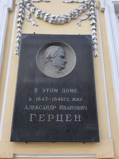 Дом-музей А. И. Герцена (переулок Сивцев Вражек, 27). Мемориальная плита в память о жившем здесь с 1843 по 1846 гг. Александре Ивановиче Герцене (1812 -1870), русском писателе, критике самодержавной монархии, одном из наиболее значимых российских последователей социализма («революционных демократов»), публицисте, педагоге, философе.