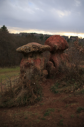 "Красные грибы" - своеобразный памятник природы, небольшая живописная группа скал из песчаника красноватого оттенка. Расположены недалеко от Долины роз парка Кисловодска. Путь к этим грибам извилист и крут - к ним ведет асфальтовая дорога с 600 метровым подъёмом. По дороге к грибам нам повстречался мирно пасущийся бычок, свора разгуливающих собак и гнедой красавец жеребец на выгуле. В этой части парка довольно малолюдно, веет одиночеством и заброшенностью. Возможно, отчасти потому что здесь расположено заброшенное и разваливающееся сооружение бассейна, построенного к Олимпиаде-80. В некотором отдолении от красных грибов находится на возвышенности...